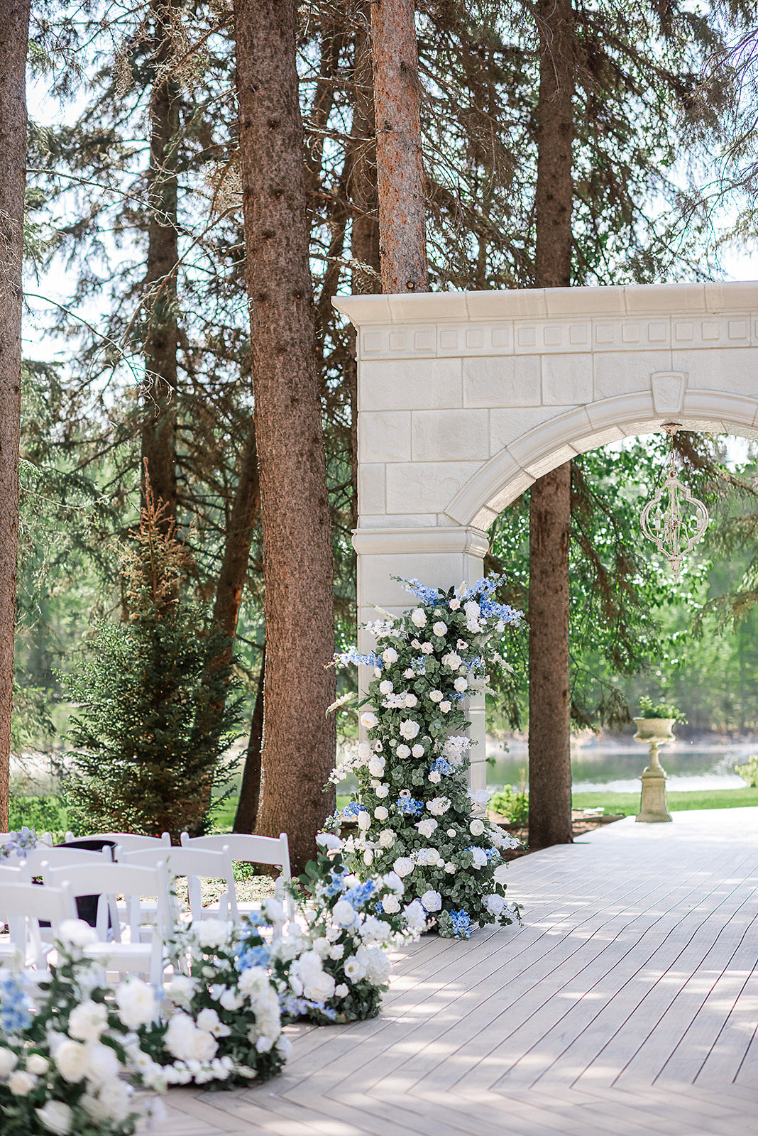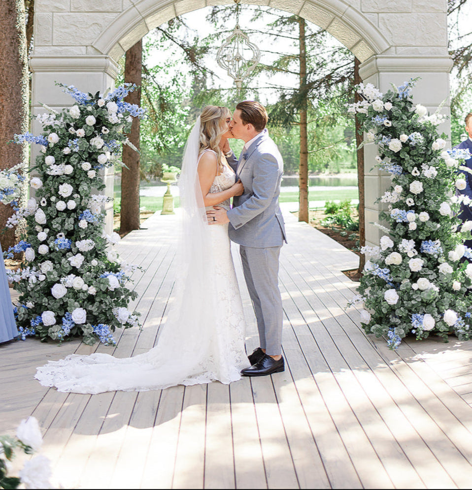 The Kaialee Pillars offer timeless elegance, inspired by the romantic charm of French vineyards. Crafted with exquisite attention to detail, these pillars feature a stunning array of ivory garden roses, pristine white playa blanca roses and a delicate blend of delphinium, veronica, ranunculus, and anemone. The lush greenery of seeded eucalyptus and sage spiral eucalyptus completes the picture-perfect ensemble, ideal for your wedding photos.
