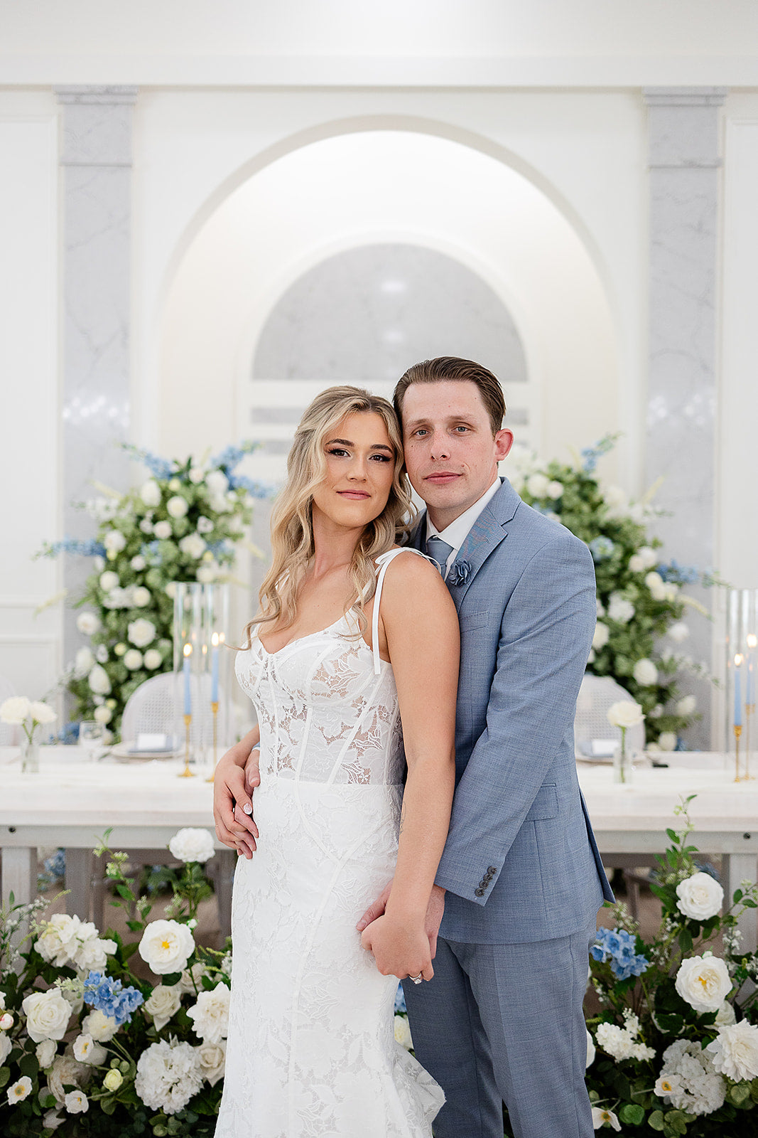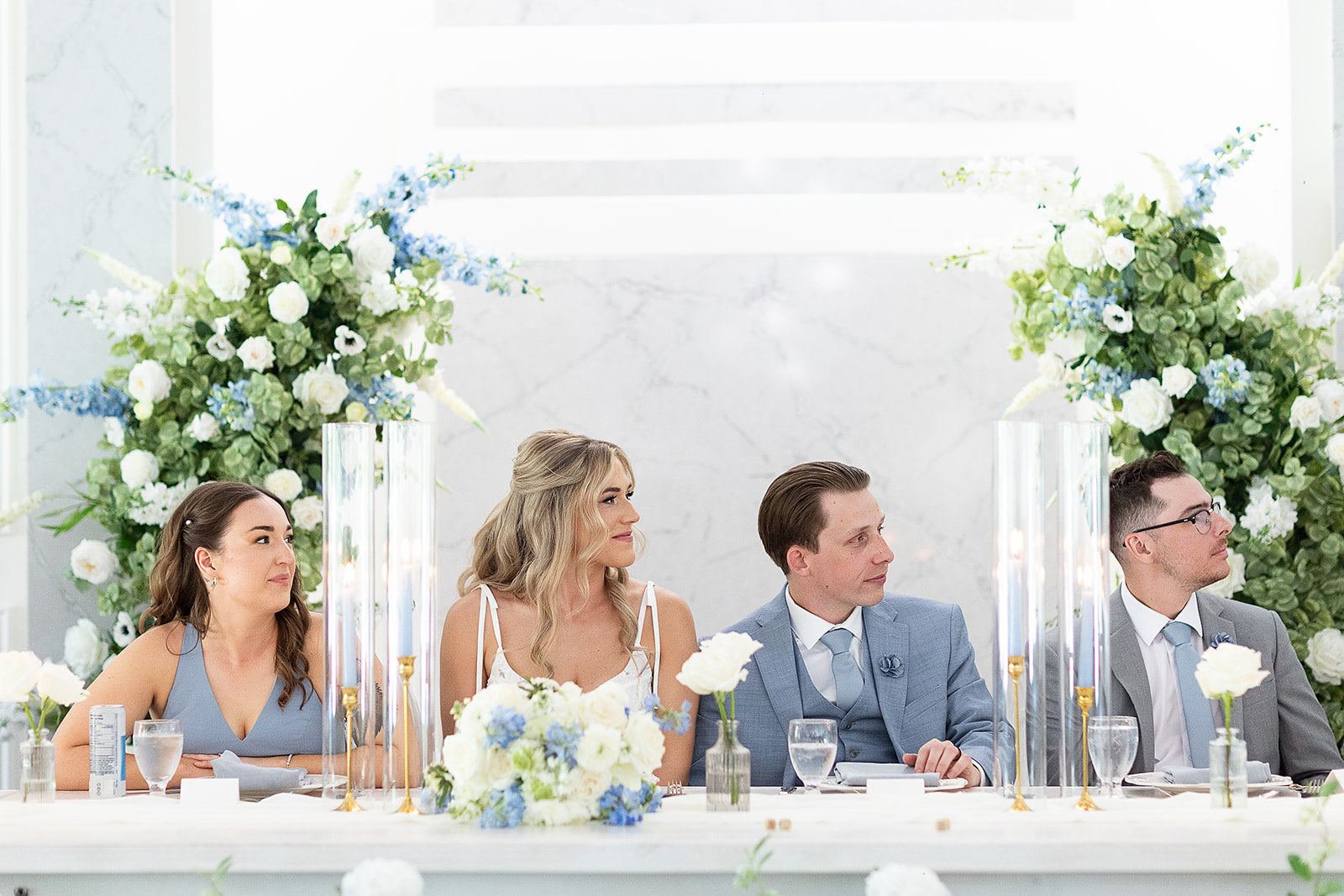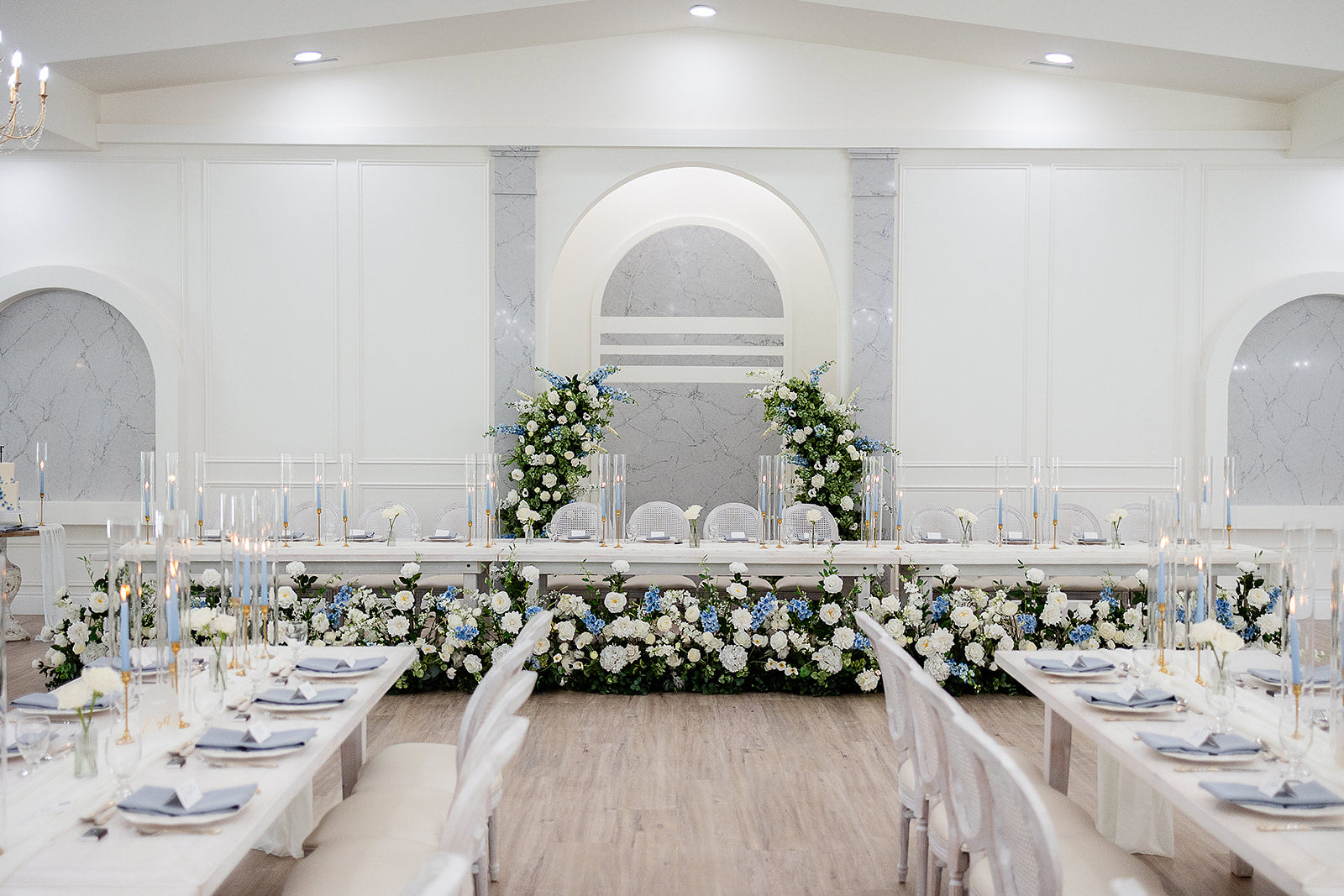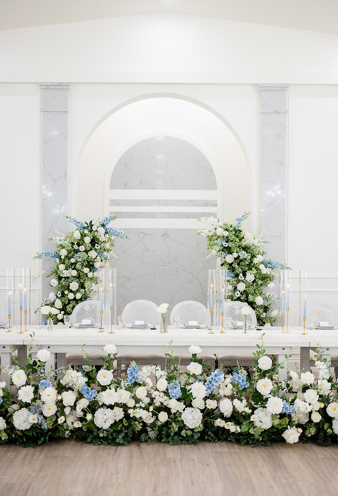 These versatile pillars can be configured as a majestic arch or as individual pillars to frame your sweetheart table, offering flexible wedding decor options.